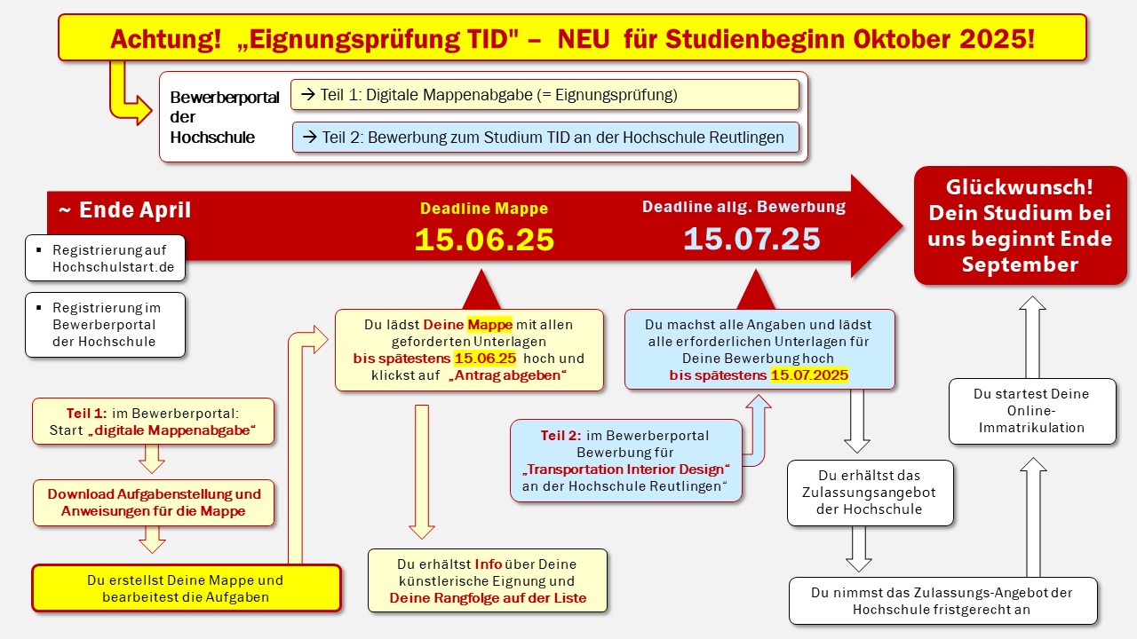 Deadline: 15. Juni - Der 2. Teil ist die allgemeine Bewerbung, ebenfalls über das Online-Bewerbungsportal der Hochschule, möglich ab Anfang Mai. Im Dropdown-Menü bei Studienfach "Bachelor Transportation Interior Design" wählen.