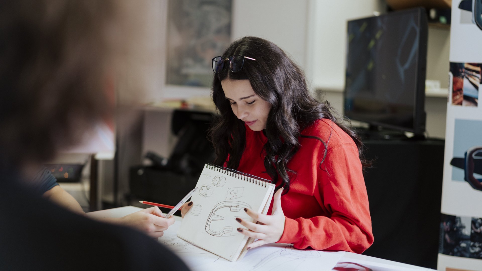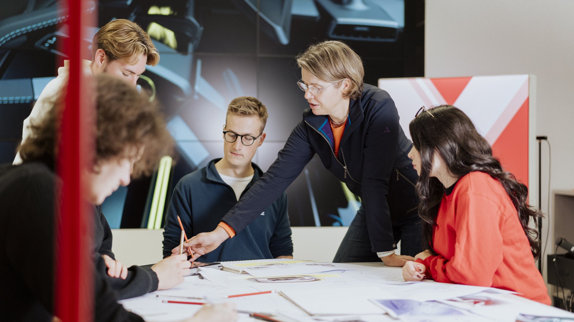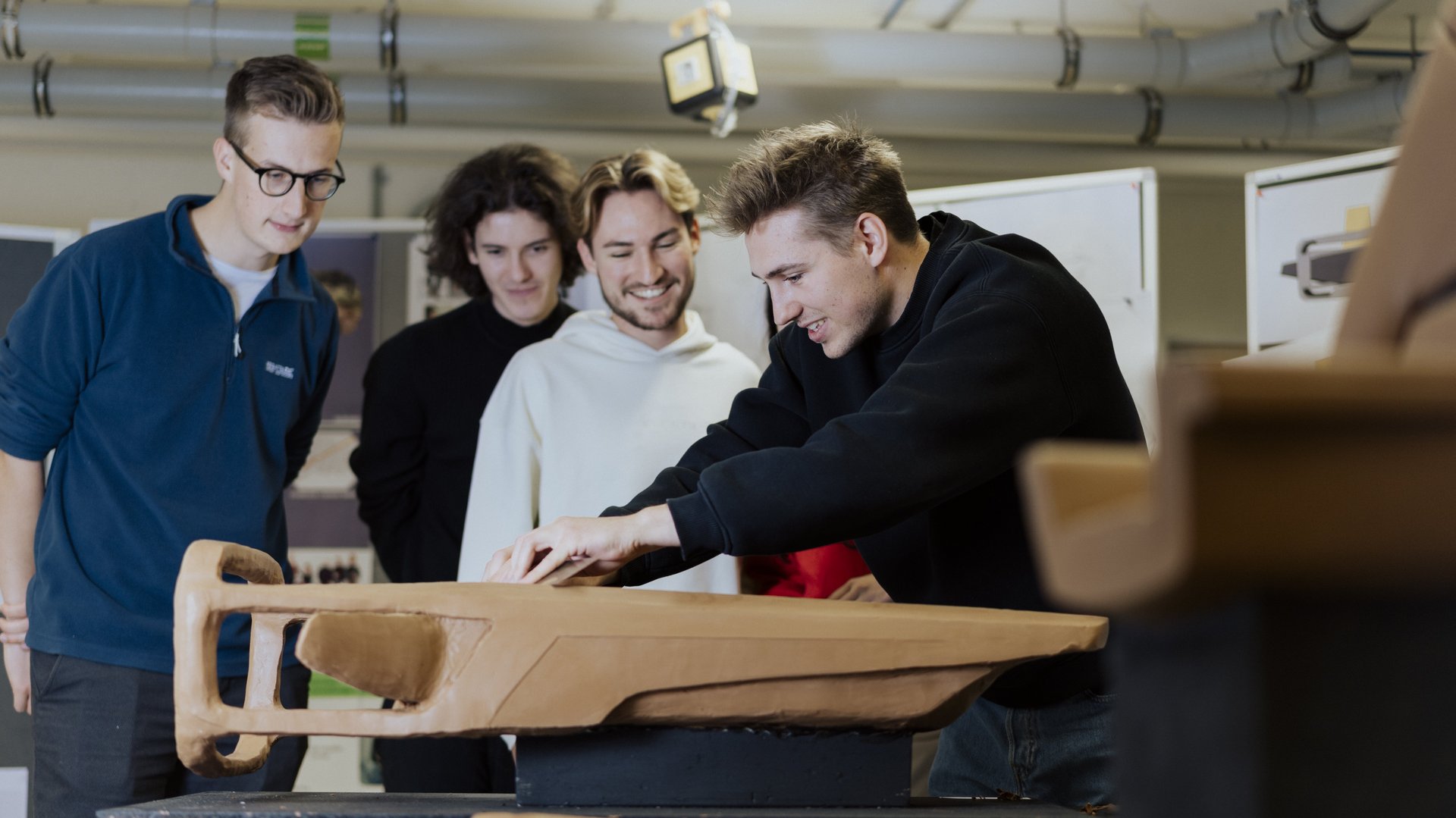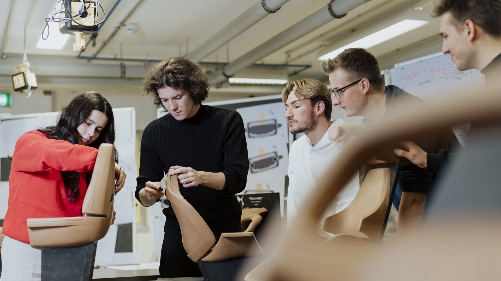 Im sogenannten Herzstück des Studiengangs „Transportation Interior Design“ werden dreidimensionale Ideen als physikalische Modelle entwickelt. Es entstehen Materialboards, künstlerische Objekte und Fahrzeug Interieur Modelle. Package wird real erlebbar, Dimensionen können im realen Raum definiert und mit Pappe und Stühlen erfahrbar gemacht.